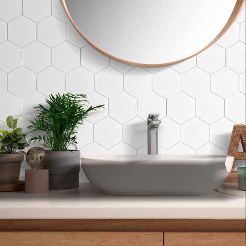 De lichte kleur van deze witte hexagon wandtegel weerkaatst het licht en laat de ruimte groter en frisser ogen. Ideaal voor kleinere ruimtes of plekken waar je extra licht wilt creëren.