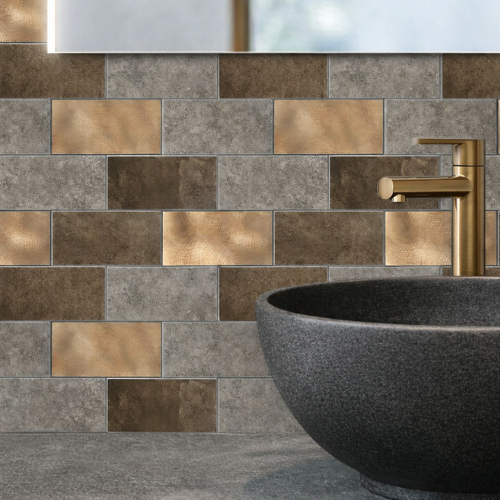 - Badkamer:Â Breng extra sfeer in je badkamer met bronskleurige tegels op de wand. Ze zijn waterbestendig en eenvoudig schoon te houden, ideaal voor gebruik bij de wastafel of als decoratieve wand.